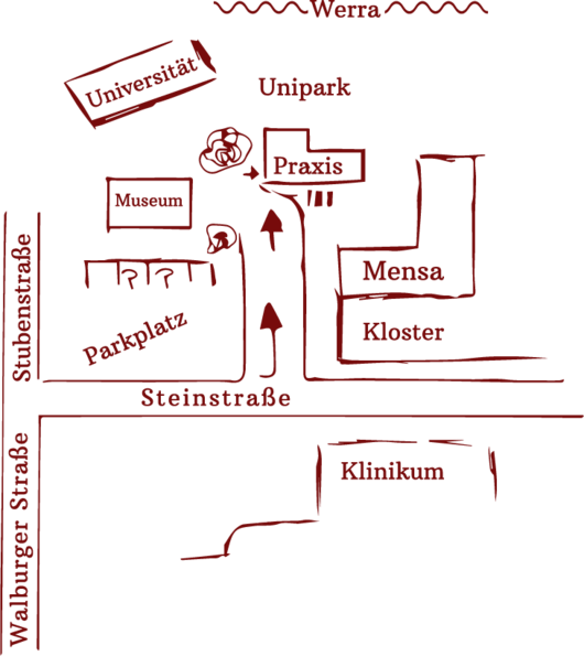 Unsere Praxisgemeinschaft befindet sich in Witzenhausen auf dem Campus der Uni nahe der Mensa. Vom Krankenhaus aus kommend führt eine kleine Straße gegenüber am ehemaligen Kloster mit seinen hohen Mauern vorbei. Links am Eingang der Straße befindet sich eine Arztpraxis. Diese kleine Straße führt linker Hand an Parkplätzen vorbei. Auch linker Hand befindet sich das Völkerkundemuseum. Ganz am Ende der kleinen Straße steht unser Fachwerkhaus auf der rechten Seite. Davor findet sich der Mensahof und die Mensabänke.